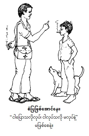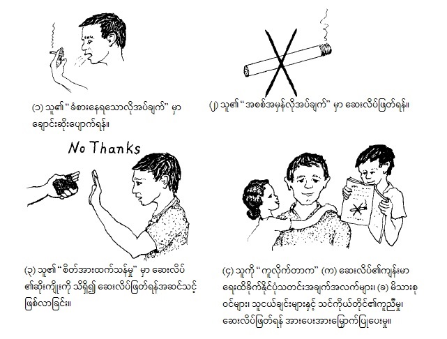 ဒေသအတွင်း အဖြစ်များဆုံးရောဂါများ အကြောင်းဖော်ပြသည့်စာမျက်နှာများကို ၄င်းတို့အားပြသကာ အမှတ်အသားပြုပေးထားပါ။ စာအုပ်သုံးစွဲပုံ သုံးစွဲနည်းကို များများအချိန်ပေးဆွေးနွေးလေလေ (သို့) အတူတူဝိုင်းဖွဲ့ဖတ်ရှုလေ့လာကြလေလေ ရပ်ရွာလူထုပိုမိုအကျိုးရှိလေ လေပင်ဖြစ်သည်။