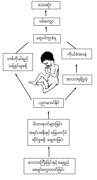 ဝမ်းပျက် ဝမ်းလျောခြင်း၊ အာဟာရချို့တဲ့ခြင်းတို့၏ နောက်ခံအကြောင်းတရားတစ်ချို့ကို ကျွန်တော်တို့ လေ့လာပြီးဖြစ်ပါတယ်။ ထို့အတူပဲ အစားအစာထုတ်လုပ်ခြင်း၊ မြေယာခွေဲဝခြင်း၊ ပညာရေးအဆင့်အတန်း၊ လူတွေအချင်းချင်းဆက်ဆံပြုမူပုံစတဲ့ အရာတွေဟာလည်း ကျန်းမာရေးပြဿနာမျိုးစုံရဲ့ နောက်ကွယ်မှာ ရှိနေကြပါတယ်။