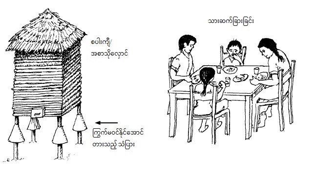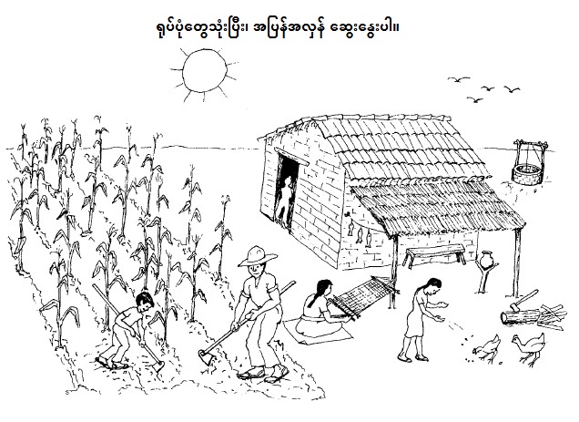 ဤနမူနာပုံမှာ ဗဟိုအမေရိကဒေသ၊ လယ်တောအိမ်ကလေး၌ နေထိုင်သော မိသားစုကိုအခြေခံရေးဆွဲထားခြင်းဖြစ်၍ သင့်ဒေသနှင့် ကိုက်ညီအောင် ပြုပြင်မွမ်းမံရေးဆွဲသင့်သည်။