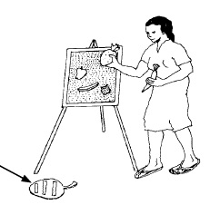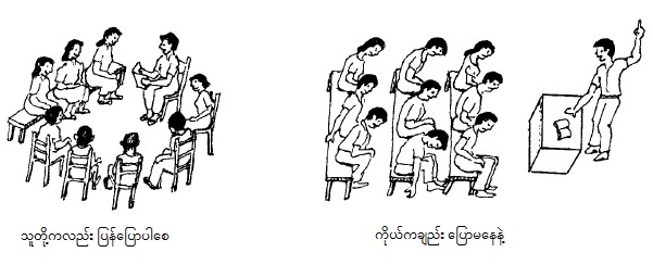 သို့သော် ရပ်ရွာလူထုကို စေုဝးဆွေးနွေးစေကာ သူတို့ကိုယ်တိုင် အချက်အလက်များရှာဖွေဖော်ထုတ်နိုင်အောင် သင်ကူညီပေးနိုင် သည်။ သင်ကသိပ်များများမပြောပါနှင့်။ ဆွေးနွေးပွဲကိုမေးခွန်းအနည်းငယ်ဖြင့် စရုံစပေးလိုက်ပါ။ မိမိတို့ရပ်ရွာကိုယ်စားပြုကာလူများ၊ တိရိစ္ဆာန် များ၊ တဲများ၊ လယ်ယာများ၊ သီးနှံများ စသဖြင့် ထည့်သွင်းရေးဆွဲထားသော ရုပ်ပုံကားချပ်များကို အသုံးချနိုင်ပါသည်။