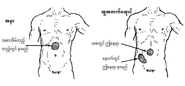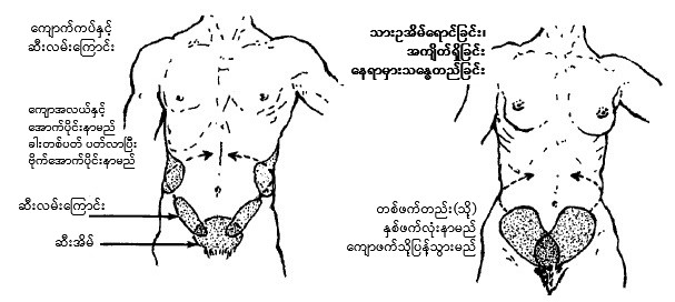 အောက်ပါပုံများတွင် ဝမ်းဗိုက်နာကျင်သောနေရာနှင့် ဆက်စပ်သော ရောဂါများကို ဖော်ပြထားပါသည်။
