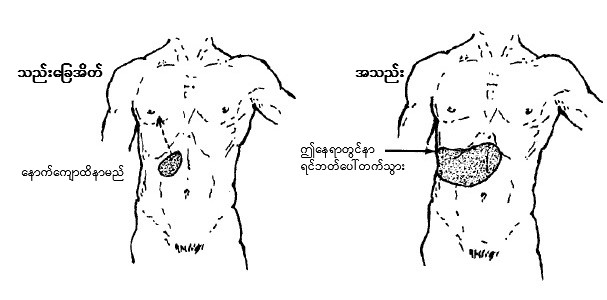 ဝမ်းဗိုက်ကို ကြည့်ပါက ပထမဦးစွာ ပုံမမှန် အလုံးအကျိတ်များရှိမရှိကြည့်ပါ။