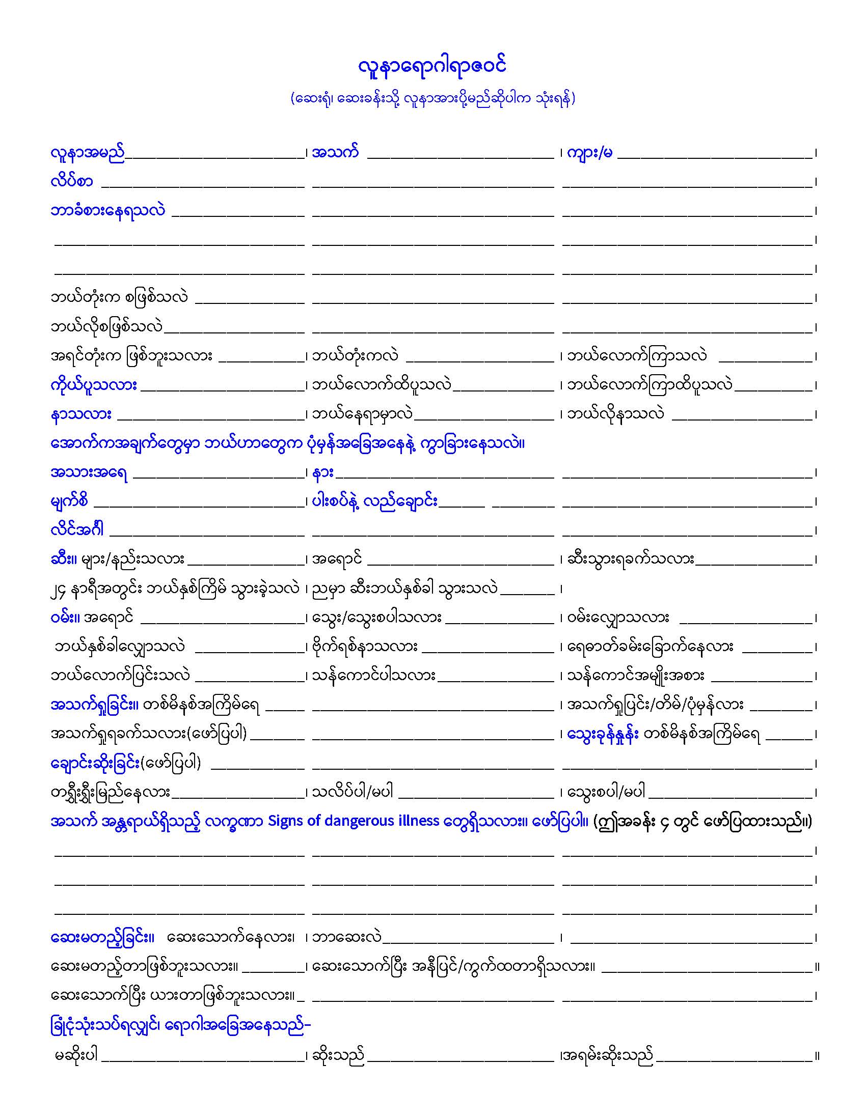 ဆေးရုံ၊ ဆေးခန်းသို့ လူနာအားပို့မည်ဆိုပါက လူနာအကြောင်းရေးမှတ်ထားသော ဖောင်ပုံစံကို တစ်ပါတည်း ထည့်ပေးရမည်။