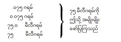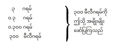 ၁၀၀၀ မီလီဂရမ် = တစ်ဂရမ် (၁၀၀၀ မီလီဂရမ်သည် တစ်ဂရမ်နှင့် ညီသည်။)