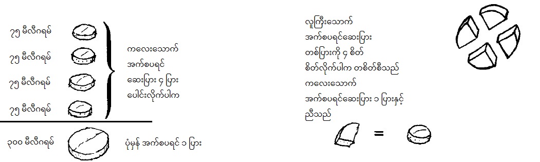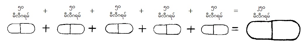ဥပမာ တက်ထရာဆိုက်ကလင်း ၂၅၀ မီလီဂရမ်ဆေးတောင့်ကို တစ်ရက် လေးကြိမ်သောက်ရမည်ဟု ညွှန်းလာပြီး၊ သင့်ထံတွင် ၅၀ မီလီဂရမ် ပမာဏရှိသည့် တက်ထရာဆိုက်ကလင်းများသာရှိသည် ဆိုပါက၊ ၎င်း ၅၀ မီလီဂရမ်အားရှိသည့် ဆေးတောင့်ကို တကြိမ် ၅ တောင့်၊ တစ်ရက် လေးကြိမ်သောက်ရမည်။