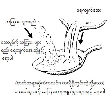 သတိပြုရန်။ ။ ကလေး မသီးစေရန် (တနည်းအားဖြင့် အဆုပ်ထဲ ရေမဝင်စေရန်) ကလေးပက်လက်အနေအထားနှင့် ရှိနေစဉ်၊ (သို့မဟုတ်) နောက်သို့ ခေါင်းလှန်နေစဉ်၊ ဆေးရည် မတိုက်ရ။ ဆေးတိုက်မည်ဆိုပါက ထိုင်နေသည့် အနေအထား၊ ရှေ့သို့ အနည်းငယ် ခေါင်းငိုက်နေသည့် အနေအထား ရှိနေပါစေ။ ကလေး တက်နေလျှင်၊ အိပ်ငိုက်နေလျှင်၊ သတိလစ် မေ့မြောနေလျှင် ပါးစပ်မှ မည်သည့် အစာ၊ မည်သည့် အရည်မျှ မကျွေးရ၊ မတိုက်ရ။
