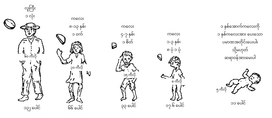 ဥပမာ။ အကယ်၍ လူကြီးအက်စပရင်ဖြင့် ကလေးအားပေးရမည်ဆိုပါက အောက်ပါနည်းအတိုင်း တွက်ချက်နိုင်သည်။