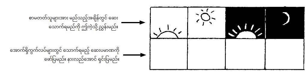 လူနာတစ်ဦးကို ဆေးပေးမည်ဆိုပါက၊ မည်သည့် အချိန်တွင် သောက်ရမည်ကို တိတိကျကျ ရေးပေးပါ။ လူနာအား ဆေးသောက်ရမည့် အချိန်များကို ပြန်ပြောပြခိုင်းပါ။ လူနာက သူသောက်ရမည့်အချိန်ကို သိကြောင်းသေချာပါစေ။