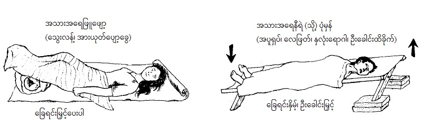 လူနာသွေးလန့်လျှင် ခြေရင်းပိုင်းမြှင့်၍ ခေါင်းပိုင်းနှိမ့်ထားပါ။