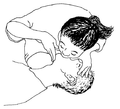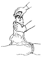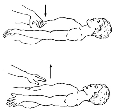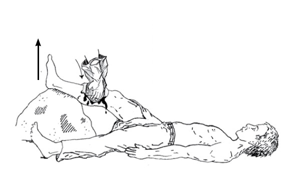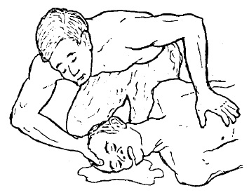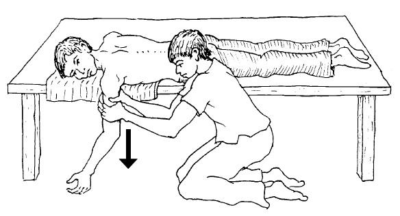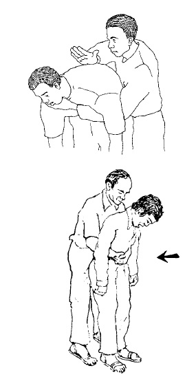 သင့်ထက်ပို ထွားကြိုင်းသောလူက သတိလစ်၍ မတ်မတ်မရပ်နိုင်လျှင် ပက်လက်လှဲထားပါ။ ဦးခေါင်းကို ဘေးသို့အနည်းငယ် စောင်း၍ လူနာပေါ် ခွထိုင်ပြီး ချက်နှင့် ရင်ညွန့်ကြားကို လက်နှစ်ဖက်စုံထပ်၍ လက်ဖနောင့်နှင့် ခပ်ပြင်းပြင်းဆတ်ကနဲ ရင်ပတ်ဖက်သို့တွန်းပါ။ တစ်ကြိမ်နှင မရလျှင် အကြိမ်ကြိမ်လုပ်ပါ။ အသက်မရှုနိုင်သေးလျှင် ပါးစပ်ချင်းတေ့၍ အရေးပေါ် အသက်ပြန်ရှုရန် လုပ်ဆောင်ပါ။