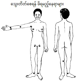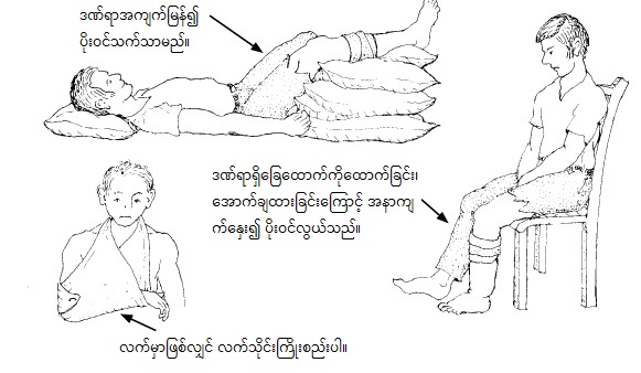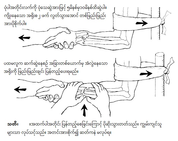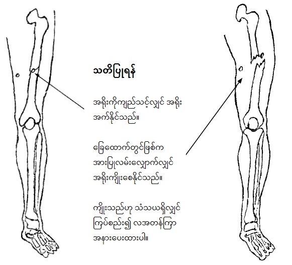 သတိ။ ။ အရိုးကျိုးသည့် ခြေ/လက်နှင့် ကျိုးကောင်းကျိုးနိုင်သည့် ခြေ/လက်ကိုမနှိပ်ရ။ မပွတ်ရ။