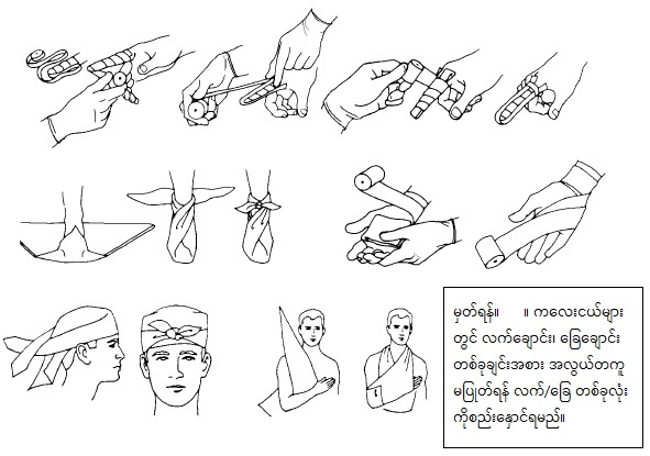သတိ။ ။ လက်၊ ခြေပတ်လည်စည်းနှောင်လျှင် သွေးအသွားအလာ ရပ်သွားနိုင်သည့်အတွက် တင်းကြပ်စွာမစည်းရ။ ပြတ်ရှ၊ ကုတ်ခြစ်၊ ပွန်းပဲ့ ဒဏ်ရာသေးများတွင် ပတ်တီးမလိုပါ။ ဆပ်ပြာနှင့်သေချာဆေး၍ လေသလပ်ခံထားပါ။ ဒဏ်ရာသန့်ရှင်းရန် အရေးကြီးဆုံးဖြစ်သည်။