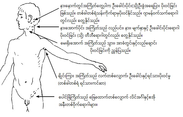 ချိုင်းကြား အကြိတ်သည် လက်တစ်လျှောက်၊ ဦးခေါင်းနှင့်ရင်သားပိုးဝင်မှု (တစ်ခါတစ်ရံ ရင်သားကင်ဆာ)။ ပေါင်ခြံကြိတ်သည် ခြေထောက်တစ်လျှောက် လိင်အင်္ဂါနှင့်စအိုအနီးတစ်ဝိုက်ရောဂါများ။