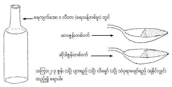 ပါးစပ်မှလုံးဝမတိုက်/မကျွေးရ။ ကျန်းမာရေးစင်တာ (ဆေးရုံ) အရောက်ပို့ရာတွင် ၂ ရက်ထက်ပိုကြာနေလျှင် ရေနည်းနည်းချင်းစုပ်၍သောက်ပါစေ။