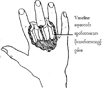 လက်ချောင်း၊ ခြေချောင်းများကြား၊ ချိုင်းကြားနှင့်အခြားအရိုးအဆစ်များအနီးဒဏ်ရာရလျှင် ဒဏ်ရာရမျက်နှာပြင်များ ထိကပ် မနေစေရန် Vaseline သုတ်လိမ်း၍ပတ်တီးစခံထားပါ။