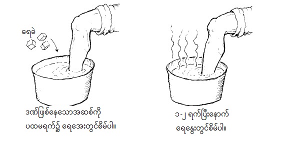 ကိုယ်အပူချိန် ၄ဝံ C ကျော်လျှင် ချက်ချင်းအပူကျအောင်လုပ်ပါ။