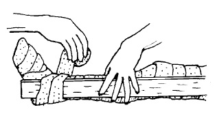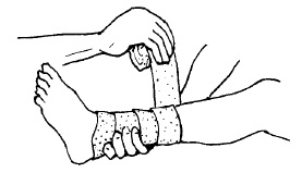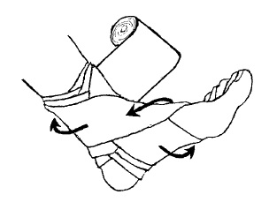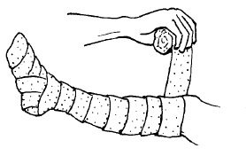 ခြေချောင်းများဘက်မှစ၍ အပေါ်ဘက်သို့ပုံပါ အတိုင်းစည်းနှောင်ပါ။ ပတ်တီးအရမ်းမကြပ်စေရ။ တစ်နာရီတစ်ခါခန့် ခဏဖြေလျော့ပေးပါ။ အနာသက်သာဆေးများပေးပါ။