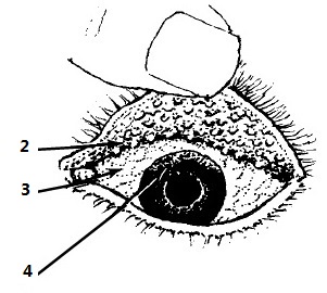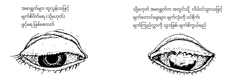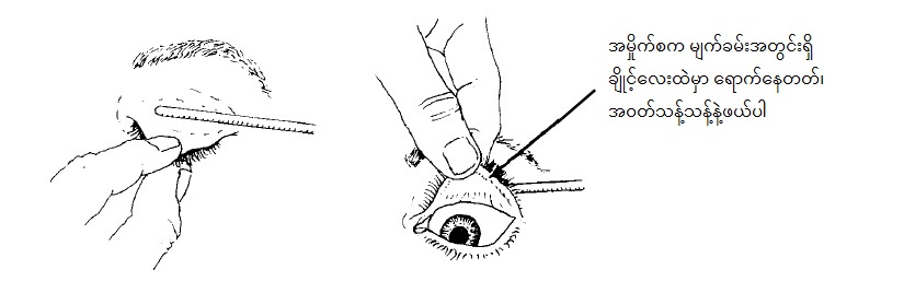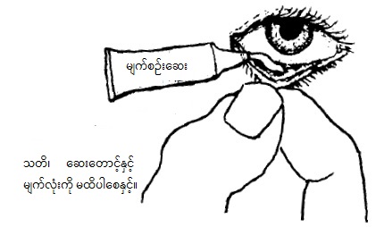 ရေနွေးဖြင့် အဝတ်သန့်သန့်ကိုဆွတ်ပြီး မျက်ဝတ်များကိုသန့်ရှင်းပါ။ ပဋိဇီဝမျက်စဉ်းအပျစ်ခတ်ပါ။ အောက်မျက်ခွံကို ဆွဲ၍ မျက်လုံး အတွင်း ဝင်အောင်ခတ်ရမည်။