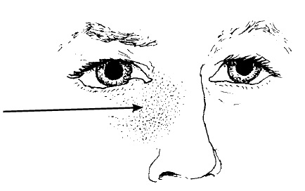 နီရဲခြင်း၊ နာကျင်ခြင်း၊ မျက်လုံးအောက်မှ နှာခေါင်းထိရောင်ရမ်းခြင်း၊ မျက်ရည်ကျခြင်း၊ ရောင်ရမ်းသည့် နေရာကို ဖိကြည့်လျှင် မျက်လုံး ထောင့်မှ ပြည်များ ထွက်လာခြင်းတို့ တွေ့နိုင်သည်။