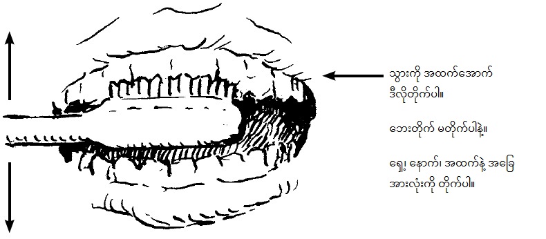 သွားကို ဘေးတိုက်အပြင်၊ အထက်၊ အောက် ပွတ်တိုက်ပေးပါ။