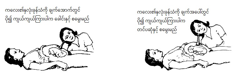 မိခင်သည်ကလေးအား မီးဖွားပြီးပြီးချင်း နို့တိုက်ကျွေးရမည်။ မွေးဖွားပြီးခါစ အစောပိုင်းရက်များတွင် နို့ထွက်နည်းတတ်သည်။ ဤ သည်မှာ ပုံမှန်ဖြစ်သည်။ စိတ်ပူရန်မလို။ ကလေးအား (၂) နာရီခြားတစ်ခါ ဆက်လက်တိုက်ကျွေးရမည်။ ကလေးနို့များများစို့ခြင်းသည် မိခင် အား နို့ပိုထွက်စေသည်။ ကလေးသည် ကျန်းမာပြီး ပေါင်ချိန်တိုးလာလျှင် ဆီးကောင်းကောင်းပေါက်ပြီး အနှီး (သို့မဟုတ်) သေးခံ ပုံမှန်လဲပေး ရလျှင် မိခင်နို့လုံလောက်သည်။