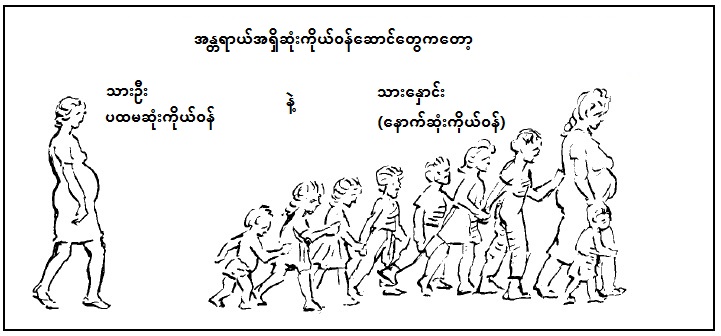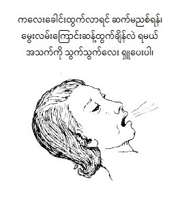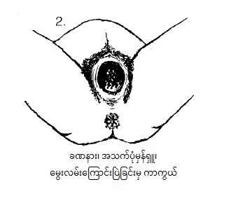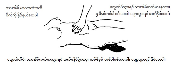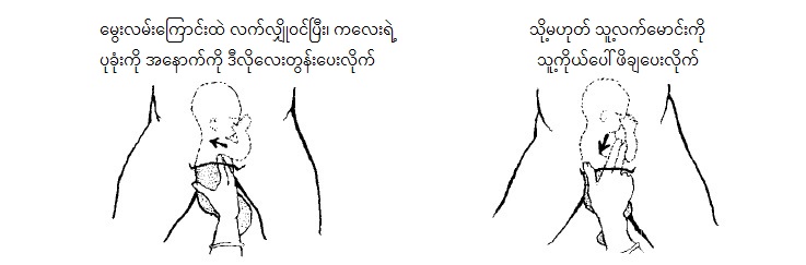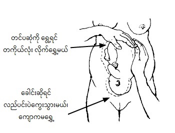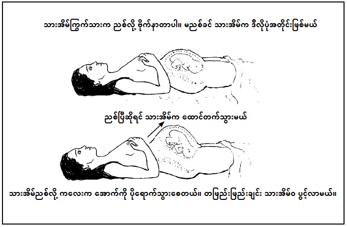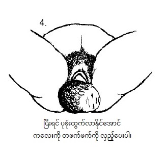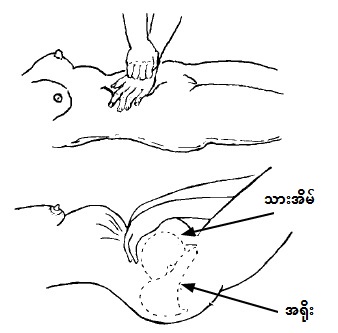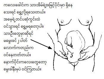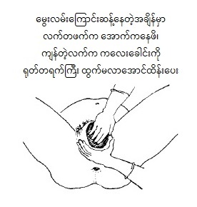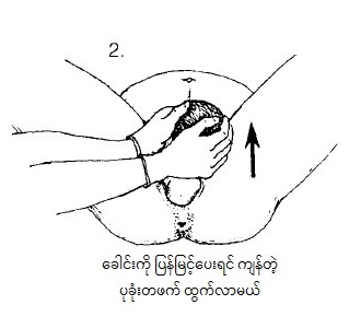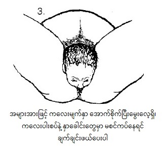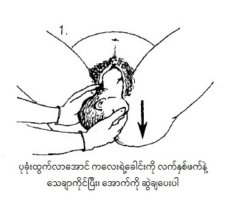 ၁။ သားဖွားဆရာမက ကလေးခေါင်းကို ဂရုတစိုက် ကိုင်ပြီး အောက်သို့ ဆွဲနှိမ့်လိုက် ခြင်းအားဖြင့် အပေါ်ဖက် ပခုံးထွက်လာမည်။