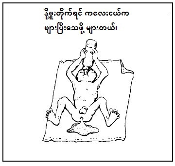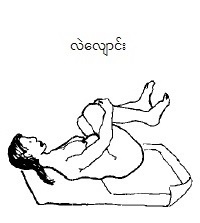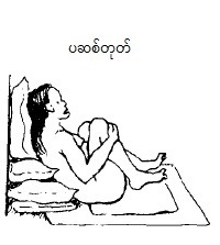 ကလေးမွေးဖွားရန် မိခင်မှာအသက်ပြင်းပြင်းရှုပြီး ဝမ်းသွားသကဲ့သို့အားကုန်ညှစ်ရသည်။ ရေမွှာပေါက်ပြီး ကလေးထွက်လာလျှင် မိခင်က သူမ၏ ဒူးခေါင်းကို အောက်ပါအတိုင်း ကွေးထားရမည်။