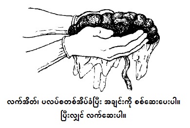 ကလေး၏ခြေထောက်ထွက်လာသည်နှင့် လက်ကို စင်ကြယ်စွာဆေး၍ အရက်ပြန်နှင့်သုတ်ပါ။ (သို့မဟုတ် ပိုးသတ်ထားသော လက်အိတ်ကို ဝတ်ပါ။) ထို့နောက်
