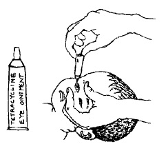 Tetracycline (သို့) Erythromycin မျက်စဉ်းဆေး(ကလေး၏ မျက်လုံးအတွင်း အန္တရာယ်ရှိသော ပိုးမွှားများ ဝင်ရောက်ခြင်းမှ ကာကွယ်ရန်)