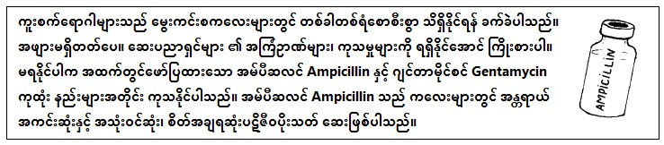 ဆေး ၃မျိုးပေးပါ။ (၁) အမ်ပီဆလင်ခေါ် ပဋိဇီဝဆေးကို ပထမအကြိမ်၌ ၂ ဂရမ် ထိုးပေးပါ။ ထို့နောက် တစ်ကြိမ်လျှင် ၁ ဂရမ်ကို တစ်နေ့လျှင် ၄ကြိမ်ထိုးပါ။ (၂) ဂျင်တာမိုင်စင်ထိုးဆေး ၈၀ မီလီဂရမ်ကို ပထမအကြိမ်ထိုးပါ။ ထို့နောက် ၆၀ မီလီဂရမ်ကို တစ်နေ့လျှင် ၃ ကြိမ် ထိုးပေးပါ။ (၃) မက်ထရိုနိုက်ဒါဇိုး ၅၀၀ မီလီဂရမ်ကို တစ်နေ့ ၃ ကြိမ် ပါးစပ်မှတိုက်ပေးပါ။ ထိုဆေး (၃)မျိုးကို အဖျားကျပြီးနောက်ထပ် ၂ရက် အထိဆက်ပေးပါ။