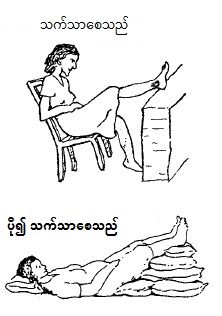 ထိုင်လျှင်သော်၎င်း၊ အိပ်လျှင်သော်၎င်း ခြေထောက်ကို ပုံတွင်ပြထားသည့် အတိုင်း အမြင့်တွင် ထားလျှင် ပို၍ ကောင်းပါသည်။